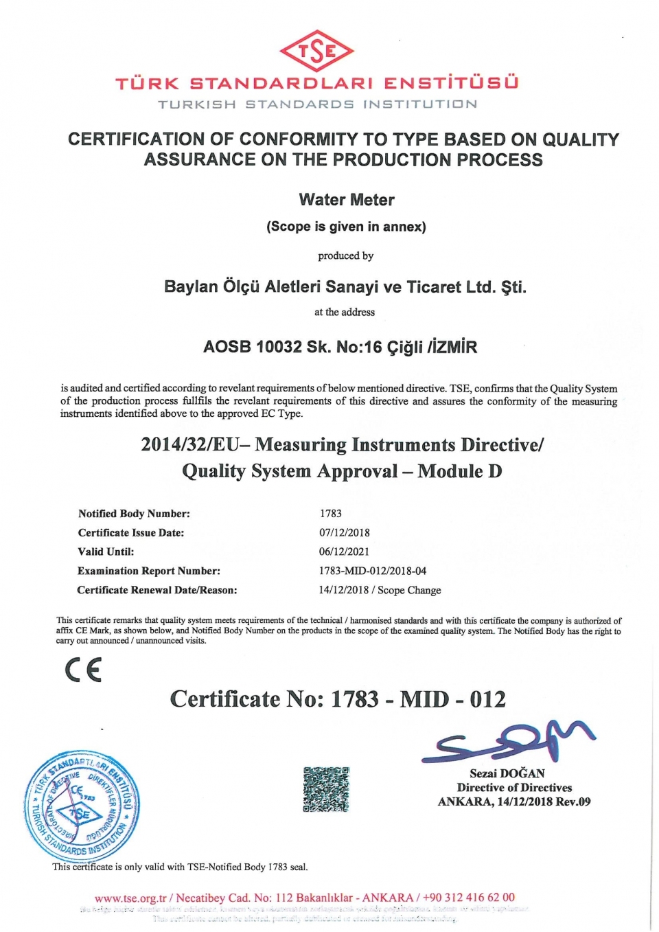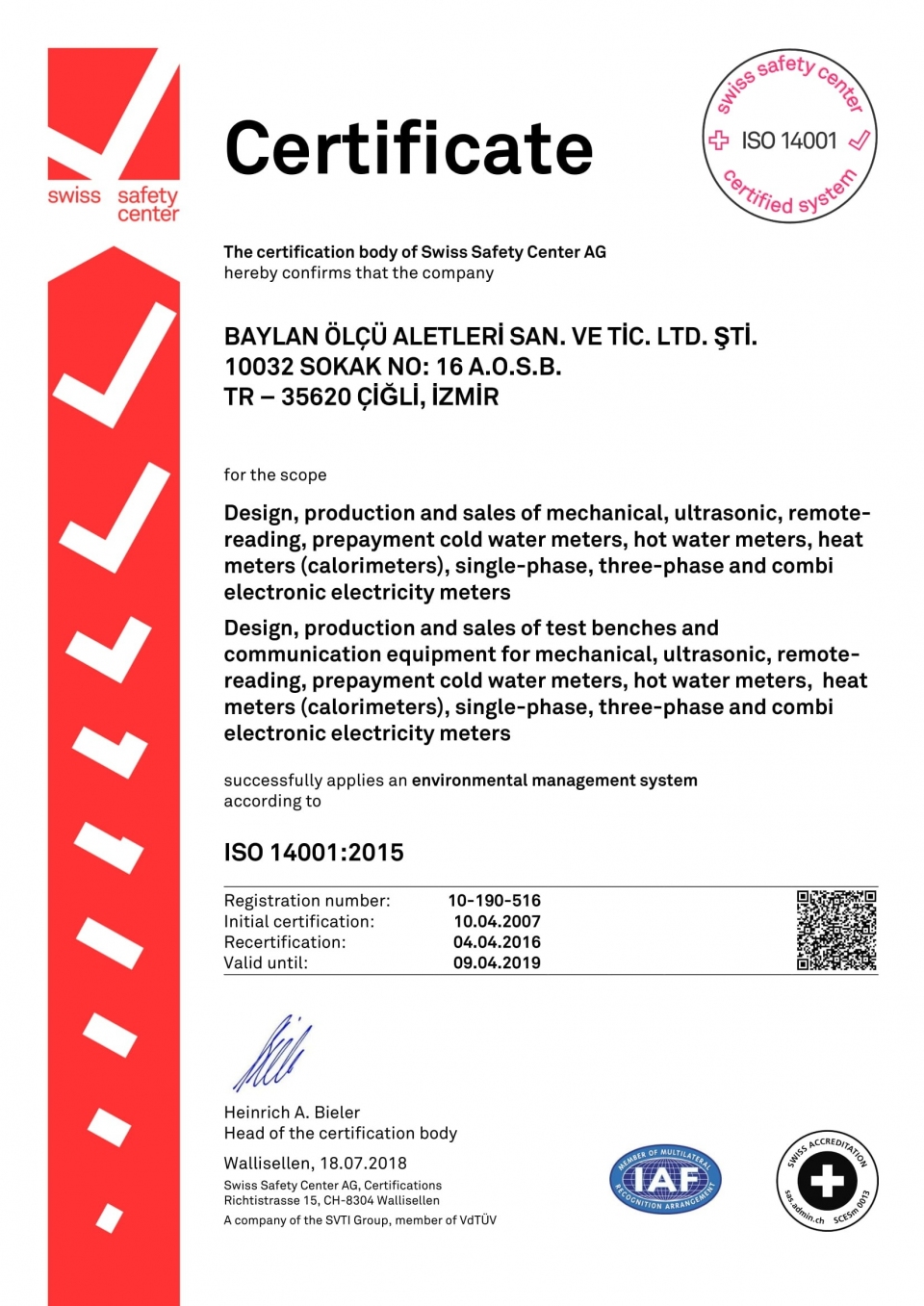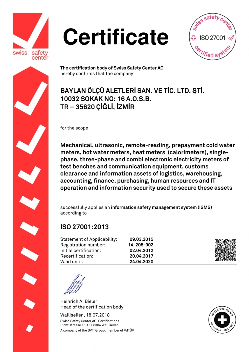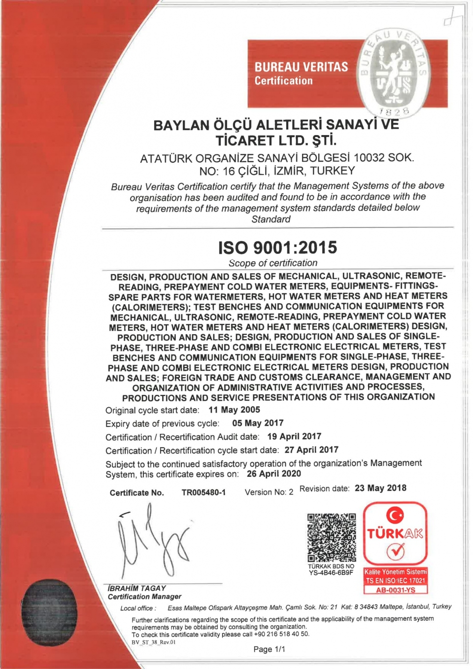 На наших підприємствах виготовляються різноманітні типи лічильників води з номінальним діаметром15 мм до 200 мм. Всі прибори схвалено офіційними інститутами європейських країн у відповідності до стандартів EEC 75/33 и 2014/32 EU. Всі лічильники сертифіковано EEC и CE. Компанія Baylan отримала сертифікат системи якості ISO 9001, виданий Bureau Veritas, а також сертификати ISO 17020, ISO 17025, ISO 27001, ISO 14001 и OHSAS 18001.