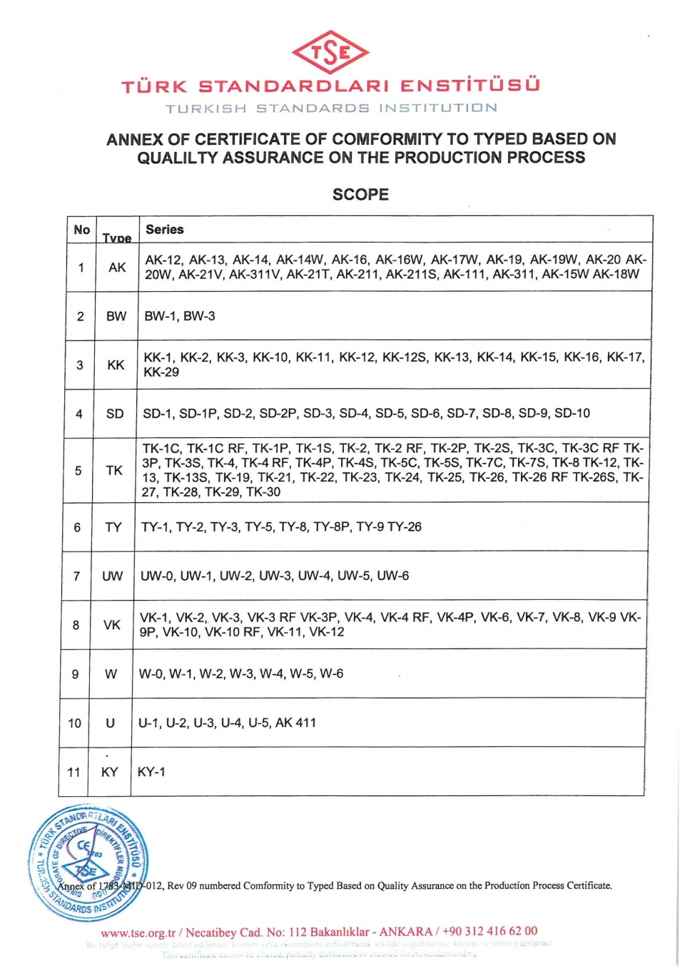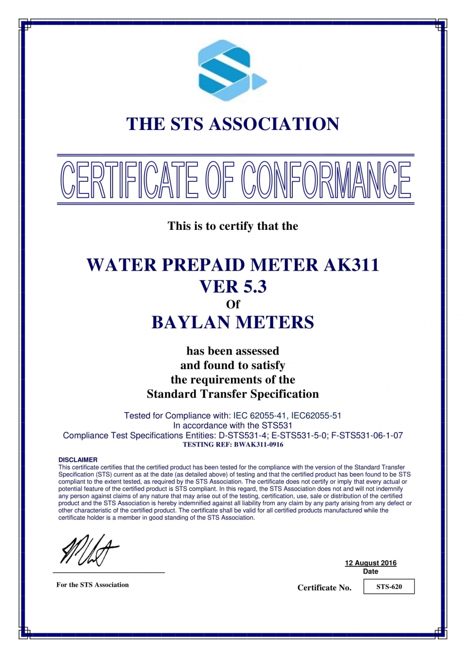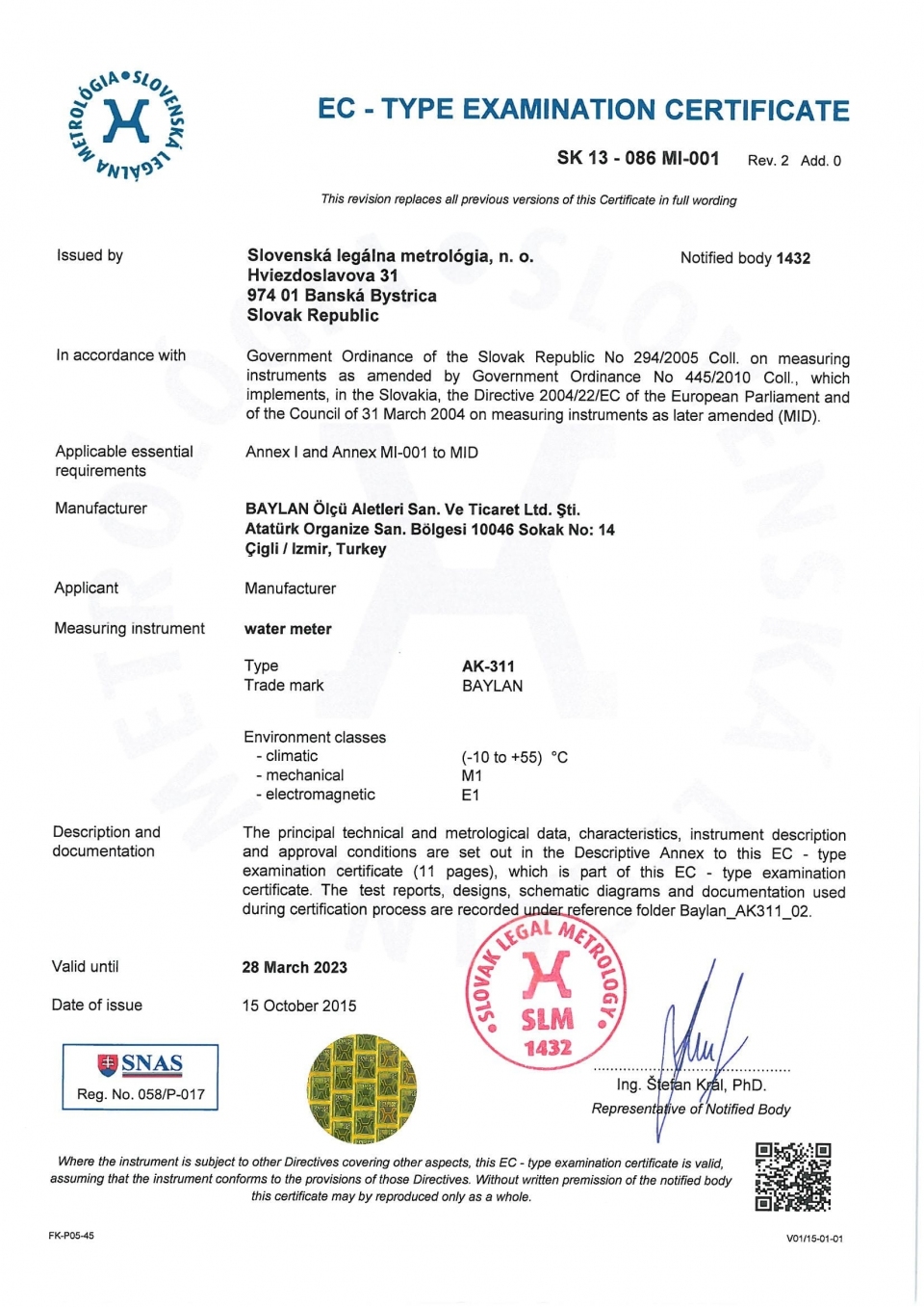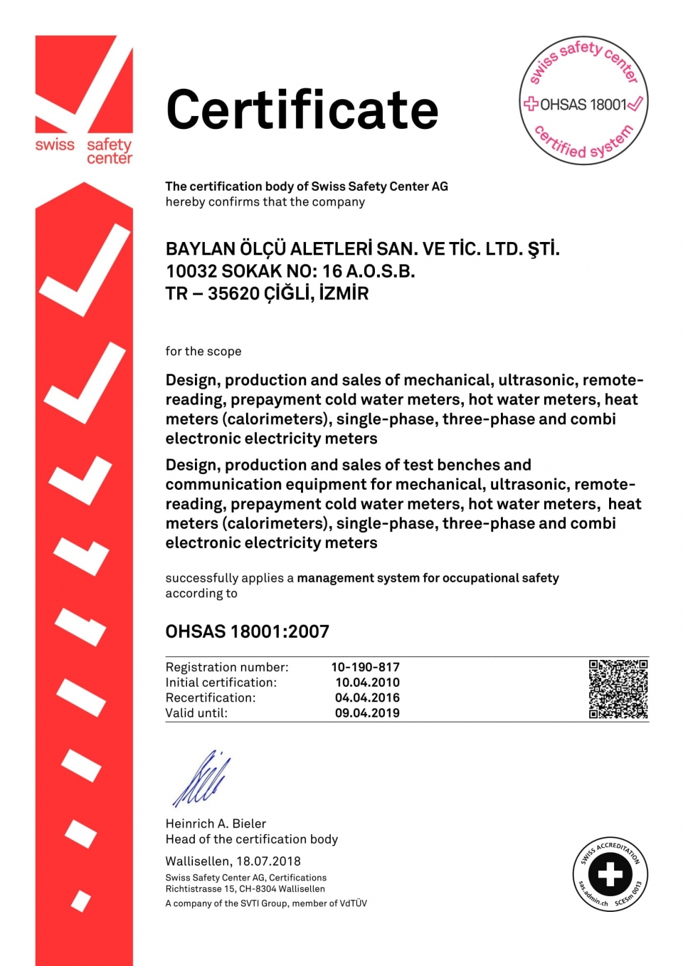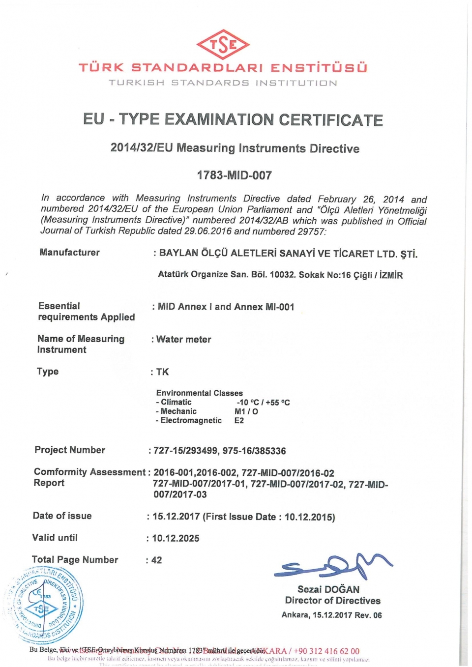 На наших підприємствах виготовляються різноманітні типи лічильників води з номінальним діаметром15 мм до 200 мм. Всі прибори схвалено офіційними інститутами європейських країн у відповідності до стандартів EEC 75/33 и 2014/32 EU. Всі лічильники сертифіковано EEC и CE. Компанія Baylan отримала сертифікат системи якості ISO 9001, виданий Bureau Veritas, а також сертификати ISO 17020, ISO 17025, ISO 27001, ISO 14001 и OHSAS 18001.